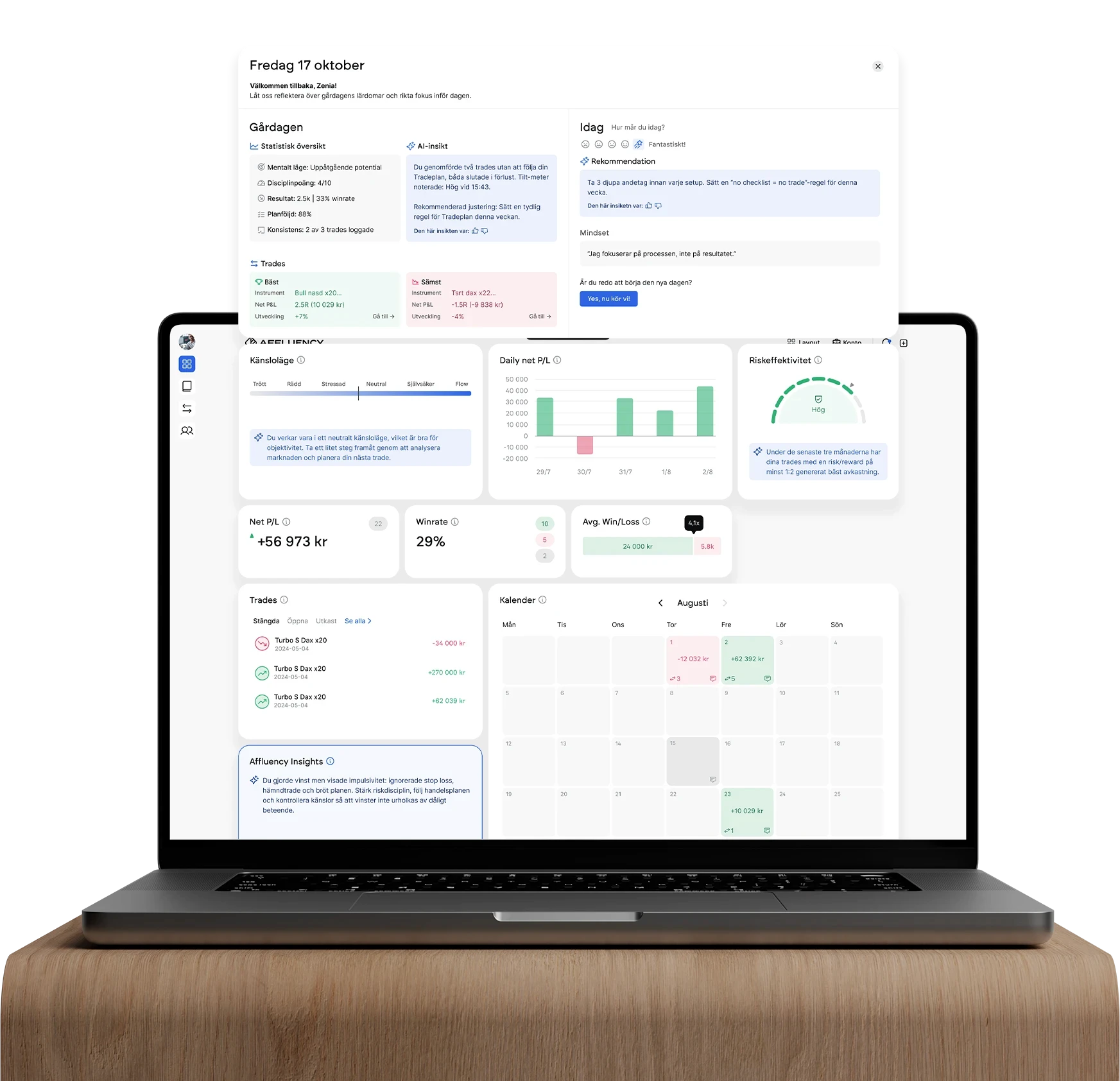 Affluency kombinerar tradingdata med AI-driven beteendeanalys. Det betyder att du inte bara ser vad som hände i dina trades, du förstår varför du fattade besluten du gjorde och hur du kan utveckla mer konsekvent disciplin över tid..