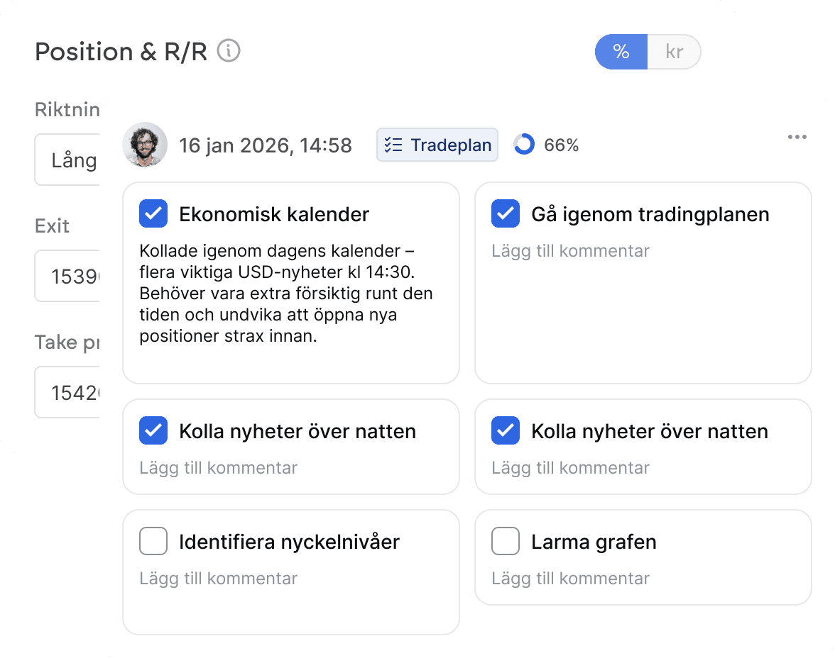 Johan handlar index och aktier intradag och vet exakt vad hans edge är, men resultaten svänger kraftigt från dag till dag. Problemet är inte analysen utan impulser, övertrading och bristande efterlevnad av planen när tempot ökar. Affluency används som ett operativt verktyg för disciplin, inte som ännu en statistikpanel.